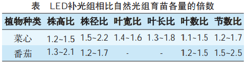根據(jù)上述設(shè)計(jì)思路,研究團(tuán)隊(duì)進(jìn)行了一系列的實(shí)驗(yàn),實(shí)驗(yàn)效果十分顯著。比如,育苗助長燈,原來使用的燈管是熒光燈,功率為32 W,育苗周期為40天。我們提供了一款12 W的LED燈,育苗周期縮短為30天,并有效地降低了育苗車間燈具溫度的影響,節(jié)省了空調(diào)耗電量。苗的粗壯度、長度和顏色都好于原有的育苗方案。對于普通蔬菜的育苗,也獲得了很好的驗(yàn)證結(jié)論,其總結(jié)如下表所示。