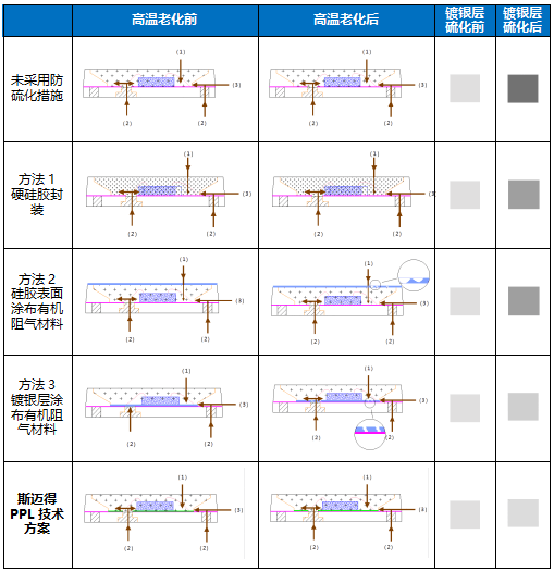 不難看出,采用硬度更高的封裝膠或表面涂布有機阻氣材料,這兩種解決發(fā)黑問題的方法都只是在膠體正面通道(1)做了改善,其他通道仍然沒有阻斷,硫、氧、溴等物質(zhì)輕而易舉的進入到LED燈珠封裝體內(nèi)部,這兩種方法效果甚差。更甚者,涂布在LED燈珠表面,在后期的加工中,有機阻氣層容易被磨損。同時,有機阻氣材料長期在高溫環(huán)境下容易降解、發(fā)生分子裂變而開裂,最終還是起不到有效的保護作用。