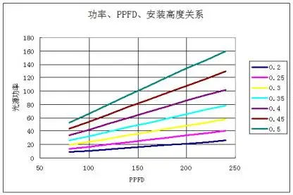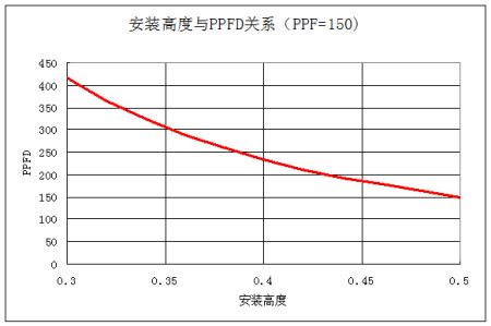 對于同一 PPF 的光源,安裝高度與 PPFD 的關(guān)系是安裝高度增加,PPFD 以 2 次方的速率下降。