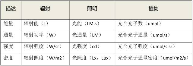 為了清晰了解輻射、照明、植物光合作用的三個概念,我們制作了下面的表格。