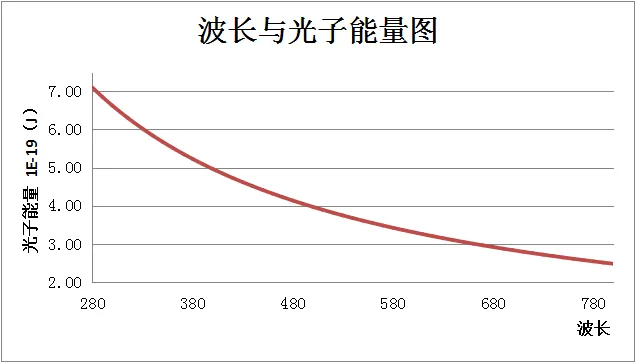 單個光子的能量在波長 400nm 與波長 700nm 的能量比是 1.75 ,也就是說,藍光比紅光能量大 1.75 倍。