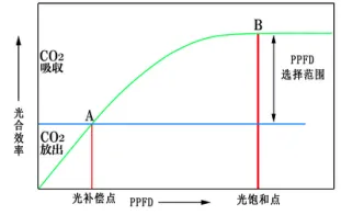 許多人熱衷研究植物輻射的補償點和飽和點來推算植物燈應(yīng)該使用多大的 PPFD,從補償點到飽和點的范圍較大(如下圖所示),在這個范圍的選擇植物燈的光量具有人為的隨機性,補償點與飽和點只是定性分析,量化過程一定要考慮其他環(huán)境因素,不可以機械的理解。