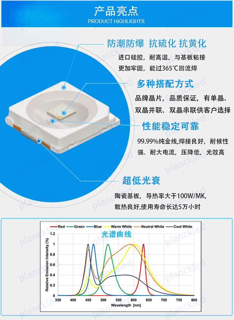 高一致性、發(fā)光面積大、低熱阻封裝、耐候性、抗UV能力強(qiáng)、使用無(wú)色差